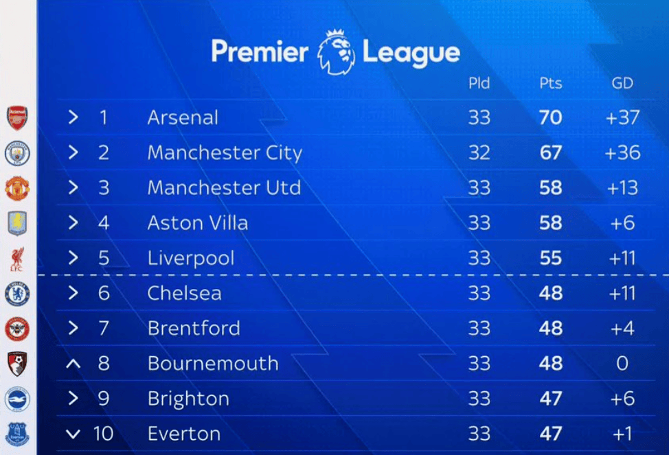 在最新的积分榜上,阿森纳33轮过后以21胜7平5负的战绩,拿到70分,排名积分榜榜首,领先优势缩小至3分。曼城少赛一轮,32轮过后20胜7平5负,拿到67分排名第二名。曼联33轮战罢,收获16胜10平7负拿到58分,排名第三名。阿斯顿维拉33轮过后17胜7平9负,同样拿到58分,排名第四名。